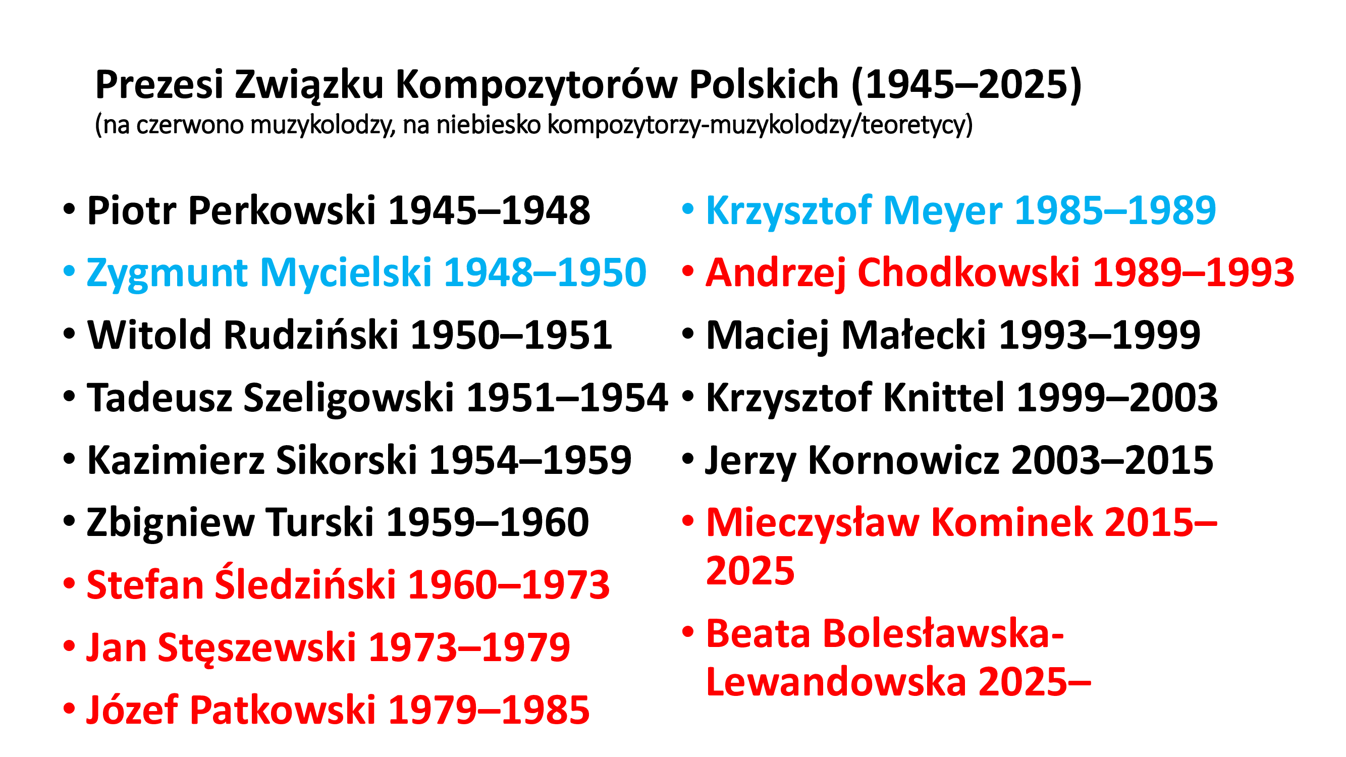 w 2025 roku Związek Kompozytorów Polskich obchodzi Jubileusz 100-lecia istnienia. Przed stu laty powstało Stowarzyszenie Kompozytorów Polskich, a przy jego narodzinach był sam Karol Szymanowski. Stowarzyszenie działało również podczas wojny, pomagając swoim członkom. W 1945 roku prezes Adam Wieniawski zdawał raport z działalności SKP na zwołanym przez nowe władze w Krakowie Zjeździe Kompozytorów Polskich. Wbrew nadziejom środowiska na kontynuowanie działalności Stowarzyszenie zostało rozwiązane, a komunistyczne władze powołały nowy Związek Kompozytorów Polskich. W 1948 roku do kompozytorów dołączyli muzykolodzy, których oczekiwanym przez komunistów zadaniem miało być kontrolowanie przestrzegania przez kompozytorów w swojej twórczości zasad socrealizmu.